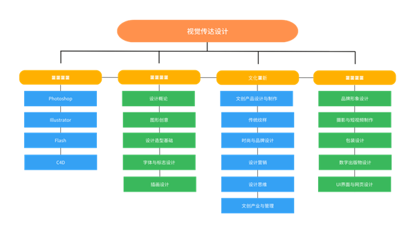 主干课程主要有:构成基础、图形创意、设计软件基础、字体与标志设计、UI界面与网页设计、商业摄影、插画设计、书籍设计、包装设计、品牌形象设计、广告与新媒体设计、文创产品设计与制作等。