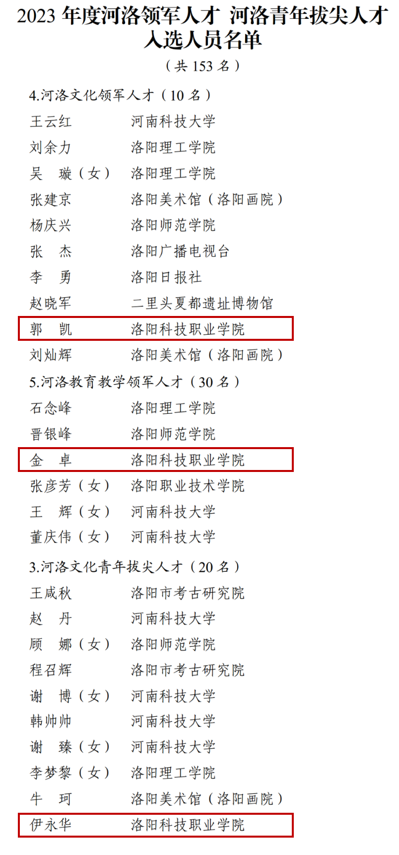 近日,洛阳市人才工作领导小组办公室公布2023年度河洛领军人才、河洛青年拔尖人才名单。洛阳科技职业英皇娱乐场