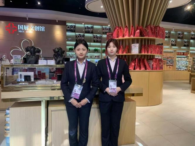 城市轨道交通运营管理专业的王双在文创中心服务。她和同学们积极投身于岗位中,用良好的精神面貌服务每一位采购商,展示了洛科学子良好的形象和精神风貌。她说,进博会不仅是一个展示中国开放姿态的窗口,更是我们学生学习和成长的舞台。