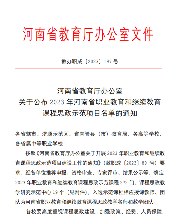 近日,河南省教育厅办公室印发了《关于2023年河南省职业教育和继续教育课程思政示范项目拟认定名单的公示》,洛阳科技职业英皇娱乐场