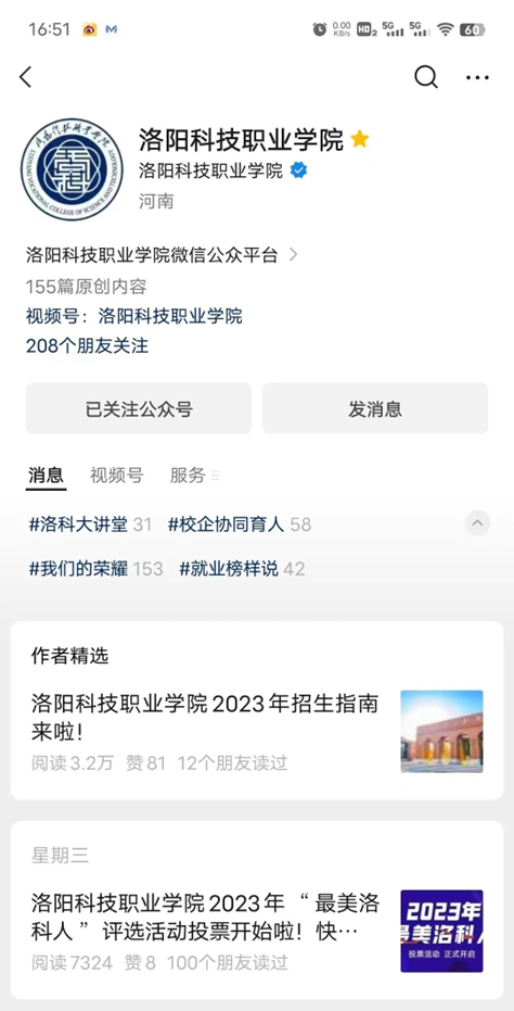 官方微信公众号自2015年创建以来,如今已拥有粉丝数6万+。近年来,洛阳科技职业英皇娱乐场