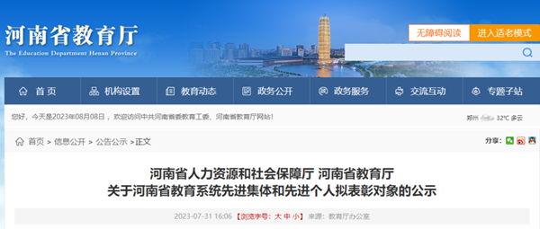 根据《河南省人力资源和社会保障厅 河南省教育厅关于评选表彰河南省教育系统先进集体和先进个人的通知》(豫人社函〔2023〕102号)的要求,经过各地、各单位逐级审核推荐,省人力资源社会保障厅、教育厅组织专家对申报的2023年河南省教育系统先进集体和先进个人进行了差额评选,洛阳科技职业英皇娱乐场