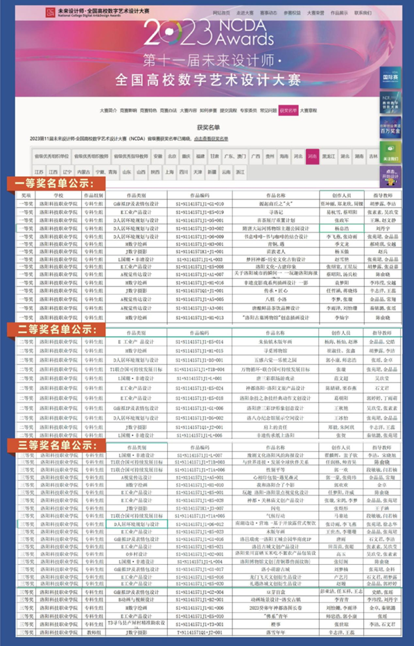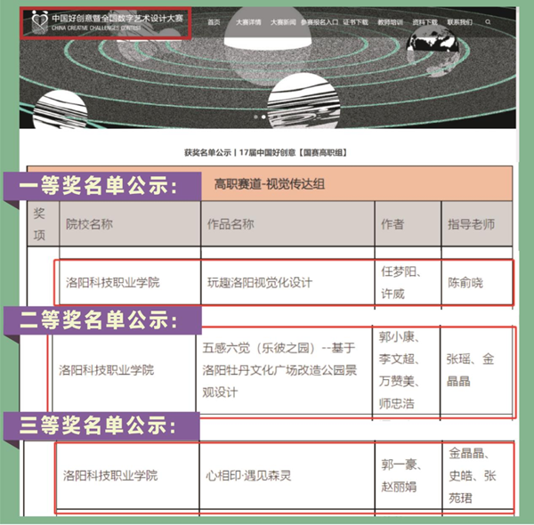 近日,未来设计师·全国高校数字艺术设计大赛(NCDA)和17届中国好创意暨全国数字艺术设计大赛结果相继公示。洛阳科技职业英皇娱乐场 获得优秀组织奖,艺术与设计英皇娱乐场 师生再创佳绩,在全国高校数字艺术设计大赛中荣获一等奖15项、二等奖11项、三等奖24项;在17届中国好创意大赛中荣获一等奖1项、二等奖1项、三等奖1项。