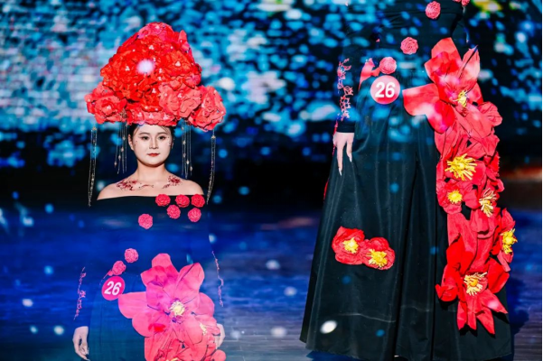 大赛以“牡丹文化” 为灵感源泉,不仅是对洛阳千年花韵的深情致敬,更是一次传统与潮流的大胆跨界融合。学生们以非遗技艺为创作之笔,将扎染、蜡染、剪纸、书法、绒花、刺绣、宣纸、拓印、缠花、簪花等丰富多样的非遗元素巧妙融入现代简约的服装设计理念中。经过层层选拔,34组匠心独运的作品脱颖而出,为全校师生带来了一场集视觉享受与文化熏陶于一体的精彩盛宴。