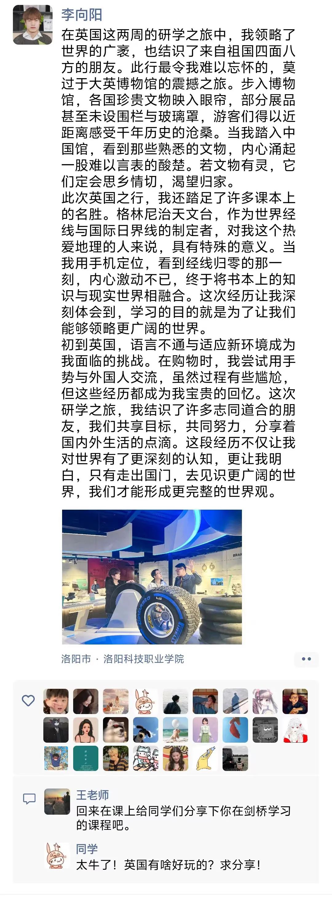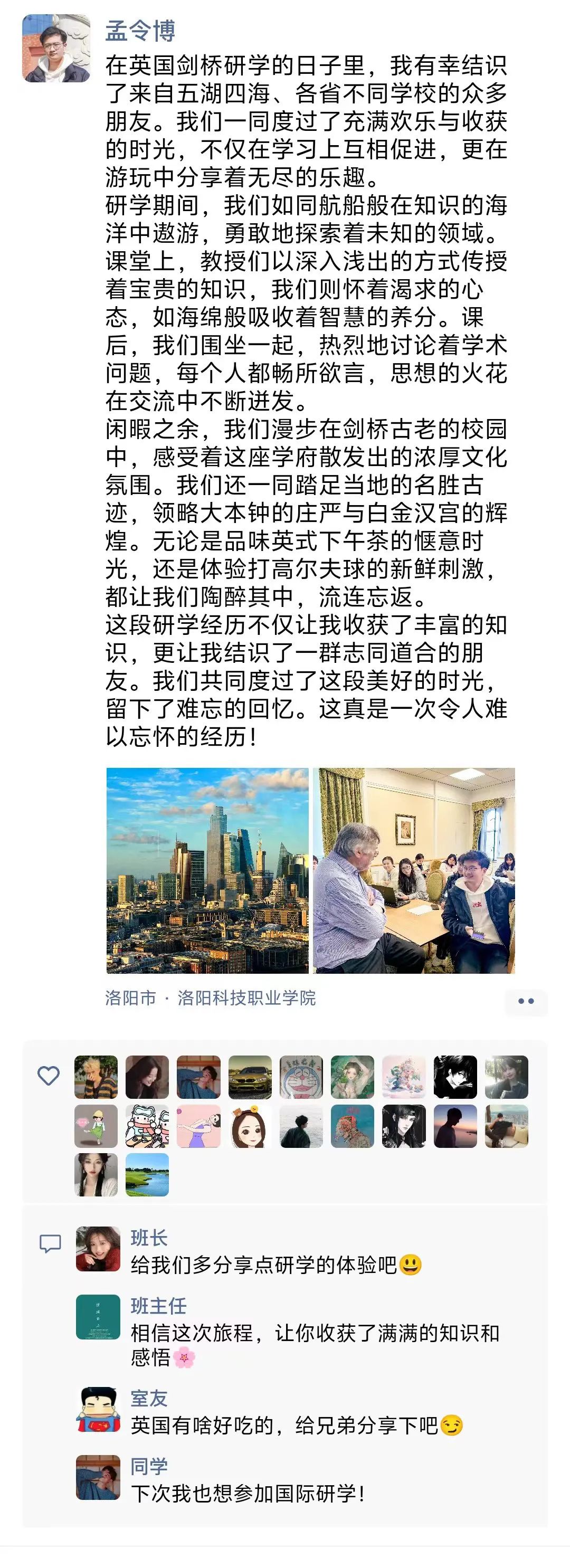 此次剑桥研学之旅为获得全额奖学金的4位洛科学子提供了一个难得的赴异国学习与交流的机会,使他们得以亲身感受世界一流高水平大学的学术氛围,不仅极大地拓宽了他们的国际视野,更让每位参与者都收获了宝贵的知识与经验。