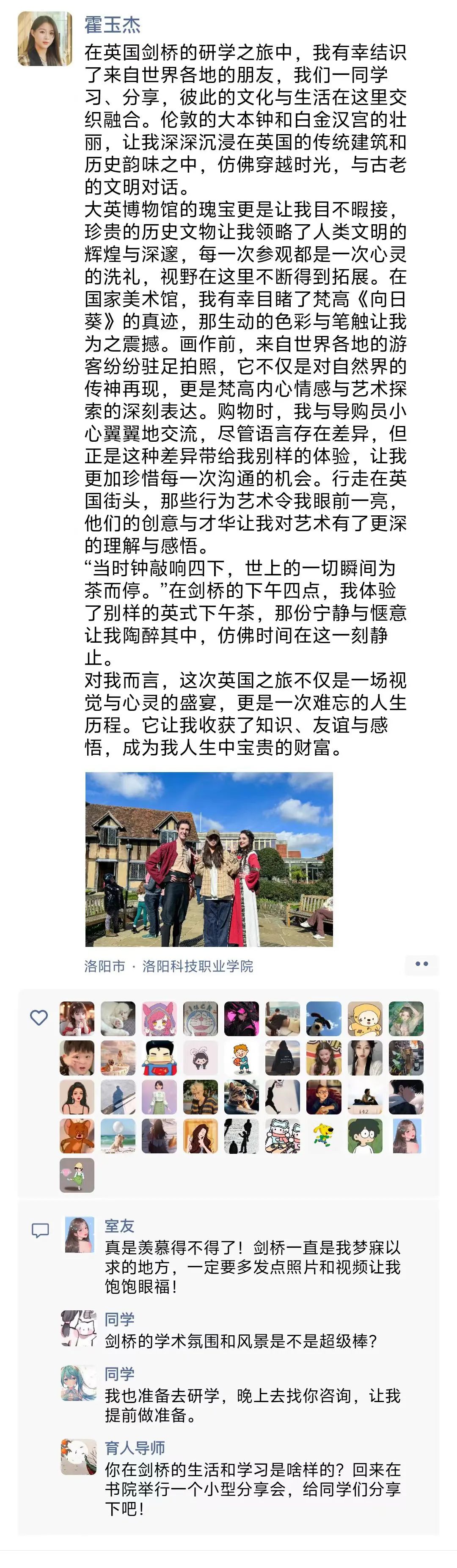 在剑桥的多样化课堂和学科领域中,他们在思维的碰撞中获得了灵感与启迪,展现了洛科学子积极向上的精神风貌和综合素养。同时,剑桥的书院制生活学习方式,更让他们深刻领略到世界一流高等学府深厚的文化底蕴,感受到了学术与生活的完美融合,也更加深刻地理解了洛科实施书院制改革的深远意义。