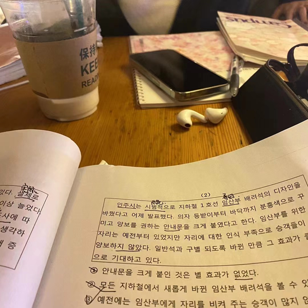 “每隔一段时间我就会总结学习心得,为的是找对韩语的学习方法。虽然我在韩语方面是零基础,但我从最基础的语言学习开始,一点一滴积累。那段时间的学习我好像回到了高中冲刺阶段。但唯一不同的是我的心态,我比之前更加自信,而且我的目标很明确,就是我必须实现我的留学梦。”