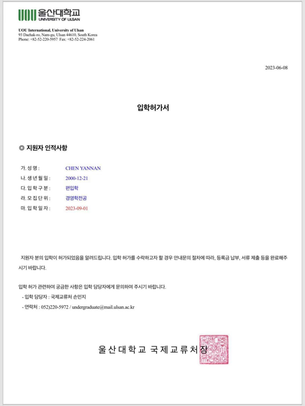 时光过的飞快,不管是笔试还是面试,陈艳楠稳扎稳打,不惧挑战。最终在考试中发挥出色,成功被韩国蔚山大学录取,并且因为成绩优异,取得了英皇娱乐场
