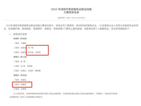 获洛阳市保育师(学生组)二等奖1项、三等奖2项;育婴员(学生组)二等奖1项。名单如下: