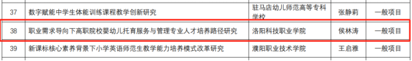 申报的《立德树人视域下“数字赋能”体育专业课程思政体系的构建与实施》获批重点研究项目,《职业需求导向下高职院校婴幼儿托育服务与管理专业人才培养路径研究》获批为一般研究项目。