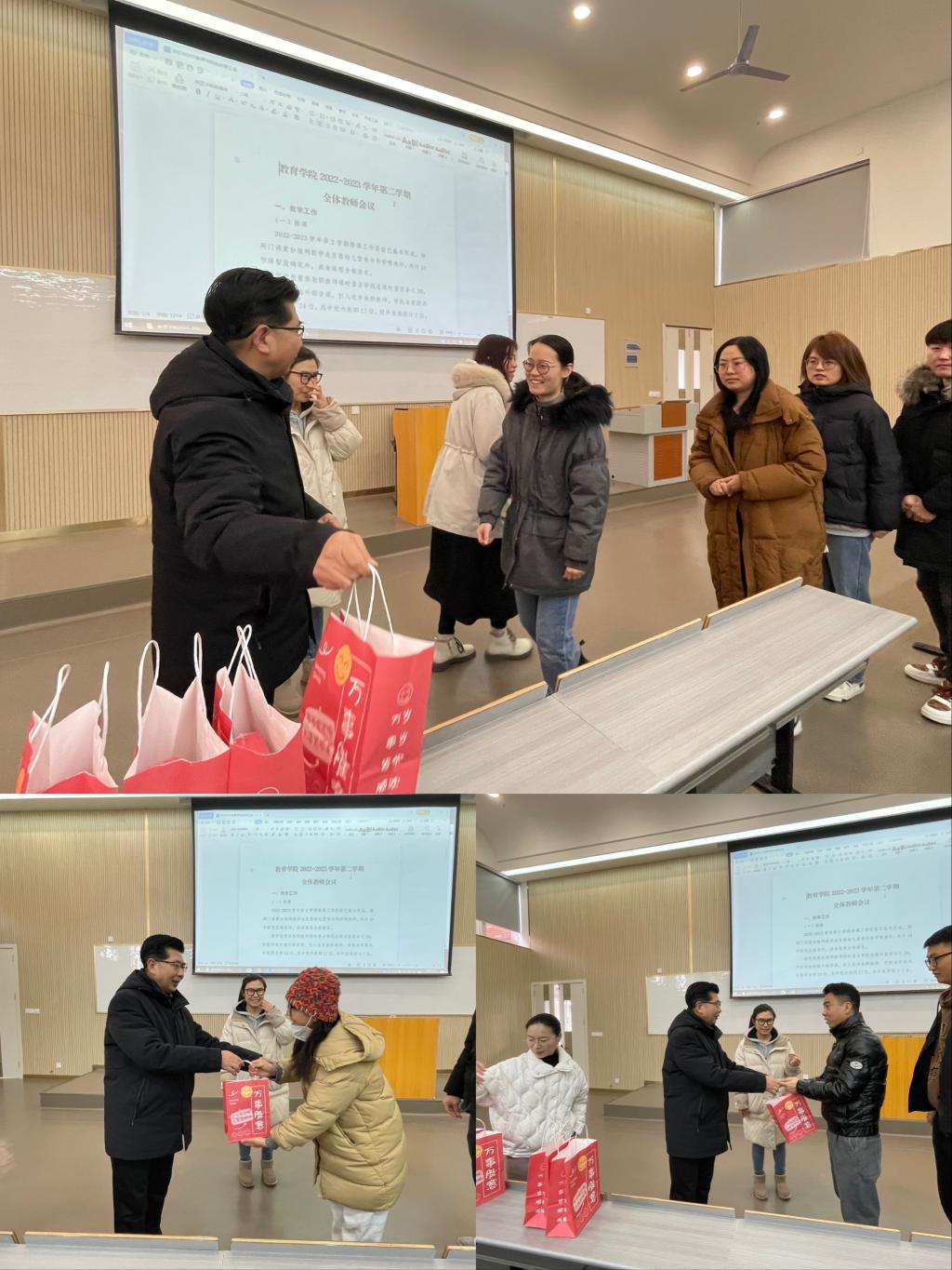 办公室精心策划开学体验活动,为每位教职工购买新年暖心“福袋”,内含精美台历一份、办公用品以及祝福贺卡一张。刘金平为每位教师送上福袋、并逐一问候,让教师们有一个温暖且有力量的新开始,给英皇娱乐场