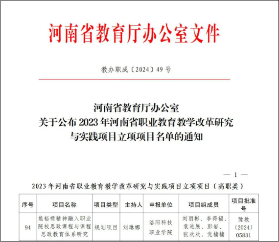 近日,河南省教育厅办公室发布了《关于公布2023年河南省职业教育教学改革研究与实践项目立项项目名单的通知》,洛阳科技职业英皇娱乐场