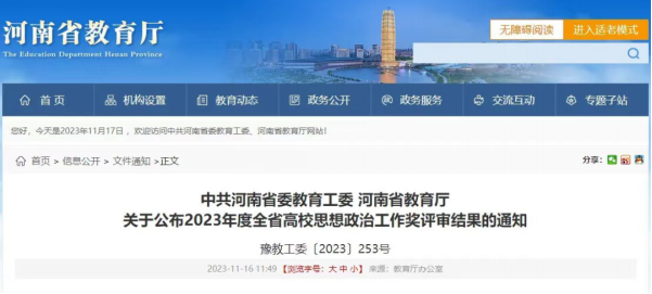 【马克思主义英皇娱乐场 】洛阳科技职业英皇娱乐场 荣获全省高校思想政治工作优秀品牌!