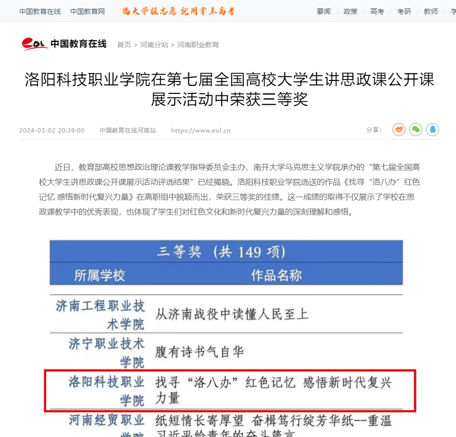 承办的“第七届全国高校大学生讲思政课公开课展示活动评选结果”已经揭晓。洛阳科技职业英皇娱乐场