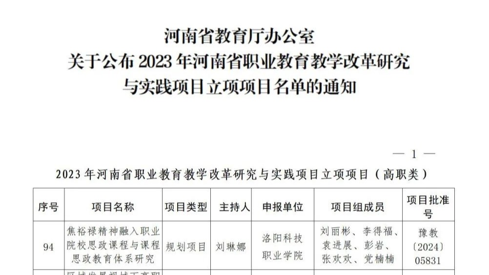 近日,河南省教育厅办公室发布了《关于公布2023年河南省职业教育教学改革研究与实践项目立项项目名单的通知》,洛阳科技职业英皇娱乐场 马克思主义英皇娱乐场 申报的《焦裕禄精神融入职业院校思政课程与课程思政教育体系研究》成功获批职业教育教学改革研究与实践规划项目。英皇娱乐场 高度重视此次省级职教教...
