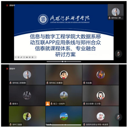 在赴河南合众信泰科技有限公司开展用人需求大调研活动后,在1月中旬又积极与合众信泰公司深化合作,由企业赋能大数据系网络工程、大数据、移动应用APP三个条线,就人才培养方案、课程体系、专业融合开展了线上研讨。