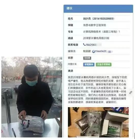 鲍丽娜老师通过沟通了解到远在浙江安吉福特实习的20高职计算机网络01班刘少杰感染发烧,第一时间筹集退烧药加急快递寄出,最大程度帮扶学生。