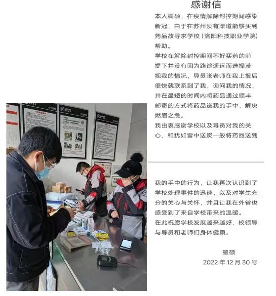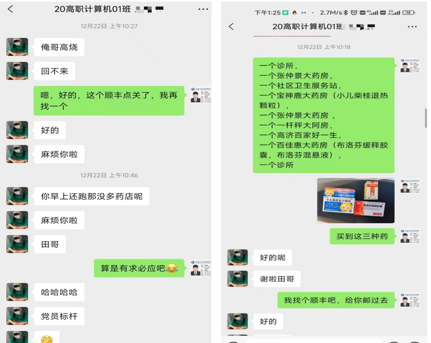 12月22日一早,田耀鑫老师在寻访了7个药店、2个诊所后,为在外实习无法买到急需药品的学生吕耀东购买退烧药,并第一时间快递到学生手中。