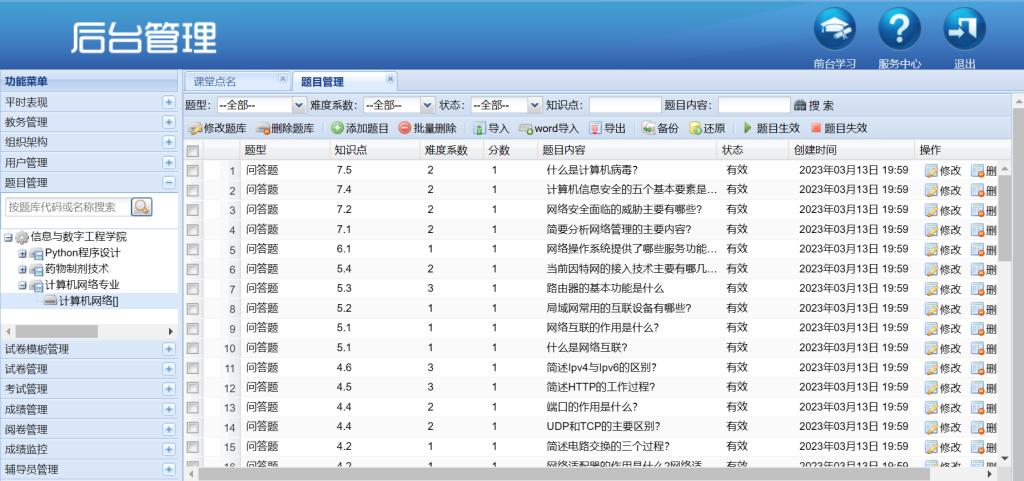 试题库建设实施方案中的规定,试题库的建设势在必行,每位老师应根据课程性质建立相应的试题库。各位老师根据课程类型不同,按照试题库建设方案要求梳理相关课程的试题、考试大纲、课程标准、考点要素表等相关内容,为下一次试题库的建设申报工作做好前期准备。