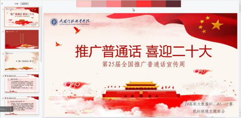 为贯彻落实第25届全国推广普通话宣传周活动,进一步增强广大师生使用语言的规范意识和推广普通话的参与意识,洛阳英皇娱乐场 信息与数字工程英皇娱乐场 聚焦“推广普通话,喜迎二十大”主题,结合疫情防控实际,精心组织,认真策划,积极开展推普宣传活动,大力宣传国家语言文字政策法规和规范标准,通过线上主题班会和线下主题班会等活动,做好语言文字推广工作。