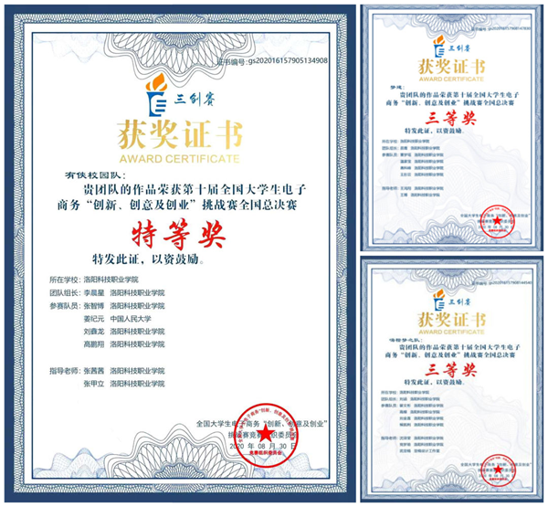 •其中,第十届全国大学生电子商务“创新、创意及创业”挑战赛获国赛特等奖