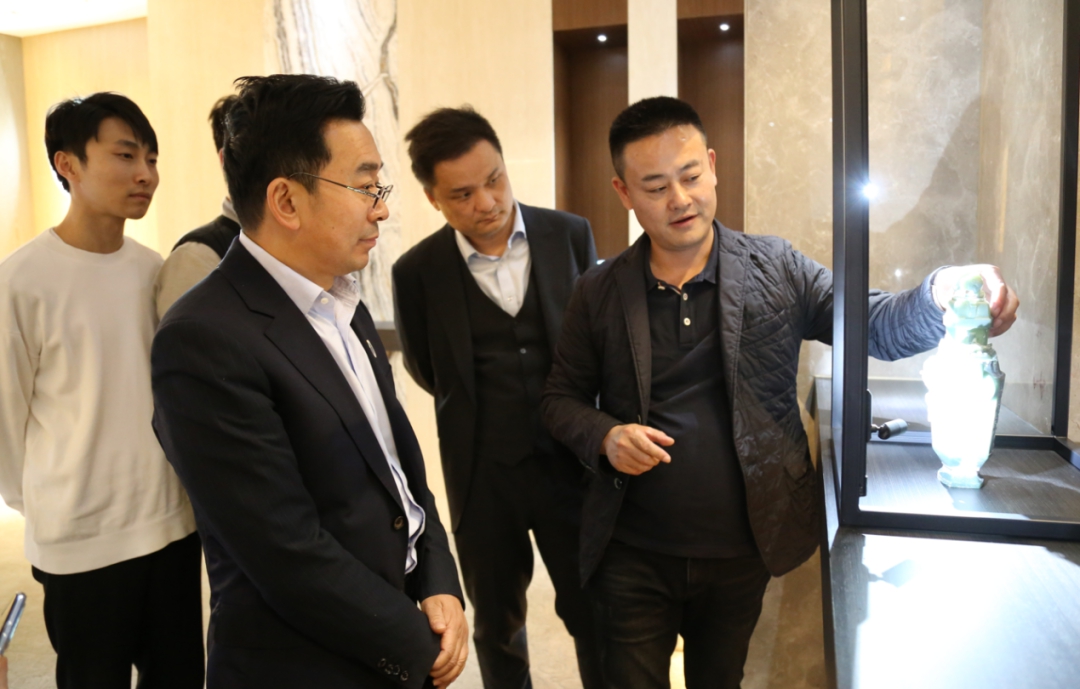 考察团一行。张嘉伟教授向考察团详细介绍了淮派玉雕艺术研究院的发展历程,并带领大家参观玉雕作品展览馆、玉雕制作工作室,了解通过传统文化复兴带动地方创新创业的做法。