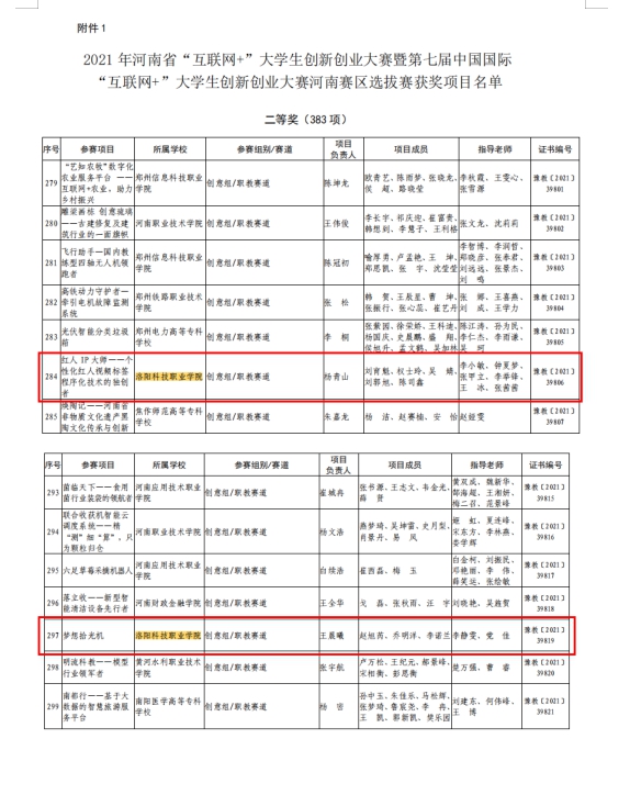近日,河南省教育厅公布2021年河南省“互联网+”大学生创新创业大赛暨第七届中国国际“互联网+”大学生创新创业大赛河南赛区选拔赛获奖名单,洛阳科技职业英皇娱乐场