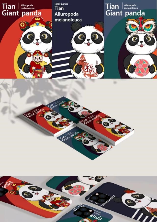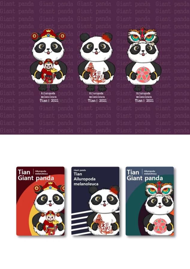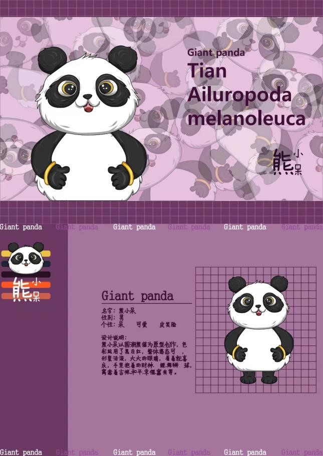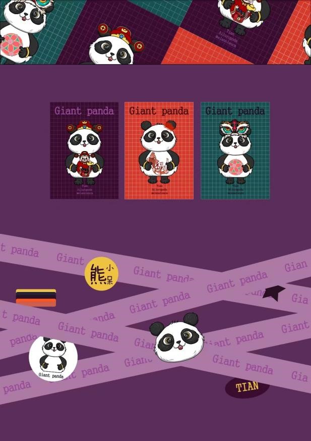 设计说明:熊小呆以国潮熊猫为原型创作,色彩运用了黑白红,整体憨态可掬,形象活泼,大大的眼睛看着就很喜庆,手里抱着的财神,锦鲤,舞狮绣球,寓意着吉祥、和平、幸福、富有等。