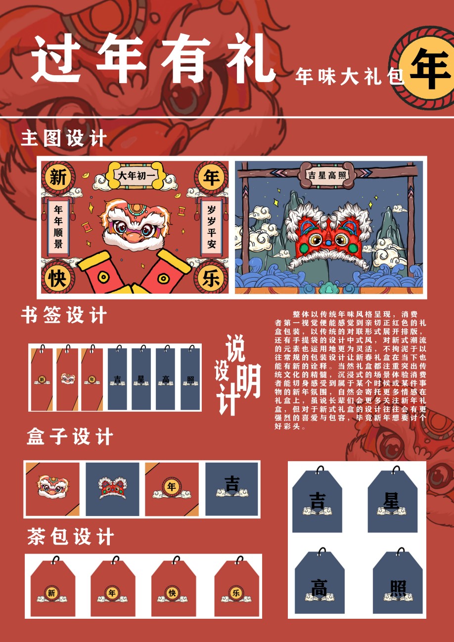 设计说明:整体以传统年味风格呈现,消费者第一视觉便能感觉到亲切正红色的礼盒包装,以传统的对联形式展开排版,还有手提袋的设计中式风,对新式潮流的元素也运用得更为灵活,不拘泥于以往常规的包装设计,让新春礼盒在当下也能有新的诠释。当然礼盒都注重突出传统文化的精髓,沉浸式的场景体验消费者能切身感受到属于某个时候或某件事物的新年氛围,自然会寄托更多情感在礼盒上,虽说长辈们会更多关注新年礼盒,但对于新式礼盒的设计往往会有更强烈的喜爱与包容。