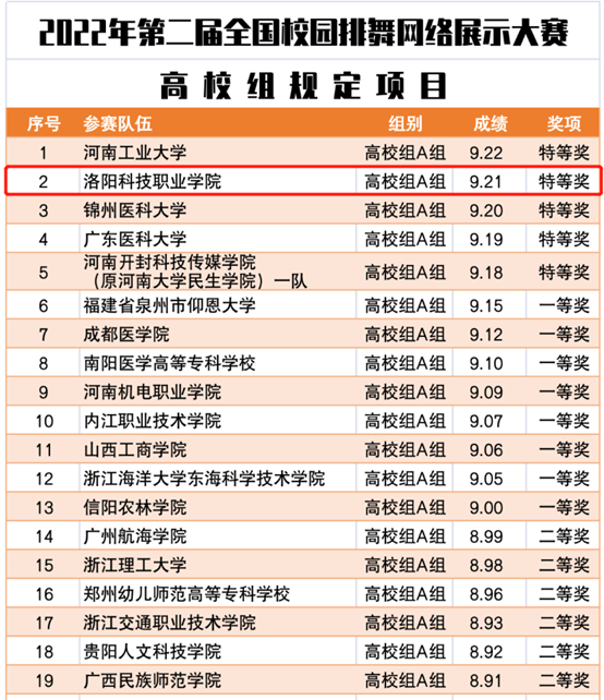 2022年7月1日-7月3日,由国家体育总局体操运动管理中心主办,中国蹦床与技巧协会排舞分会承办的2022年第二届全国校园排舞网络展示大赛圆满落幕!共吸引了来自全国20个省共254支队伍,近5万余学生参与大赛。洛阳科技职业英皇娱乐场