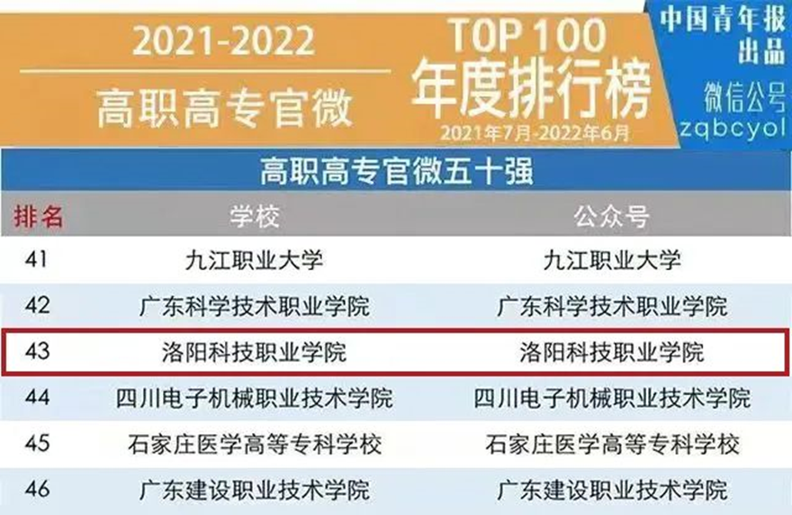 近日,在由中国青年报社主办的“青春元宇宙助力高校大思政”研讨会暨校媒精英汇上,发布了2021-2022年度中国大学官微百强、高职高专官微百强及2021-2022年度全国卓越影响力职院可视化融媒团队等榜单。