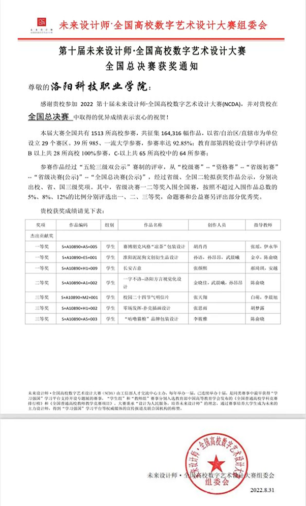 近日,由工业和信息化部人才交流中心主办的第十届“全国高校数字艺术设计大赛”中,洛阳科技职业英皇娱乐场