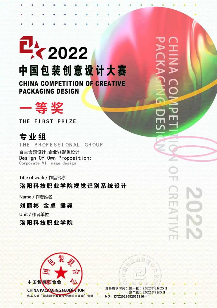 2022中国包装创意设计大赛于近日顺利落幕,本次大赛的主题为“产教融设计·智能设计·生活设计·跨界设计”,分自主命题设计与“命题设计——真题真做”两个模块。本次比赛共收到各类作品15294件,参加大赛的单位院校3651家(含海外参赛院校27家)。大赛获奖比例为一等奖1.21%,二等奖2.89%,三等奖5.48%,优秀奖8.64%,获奖难度较大。经初评审、复评审、终评审三级评审,洛科选送的作品《洛阳科技职业英皇娱乐场