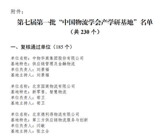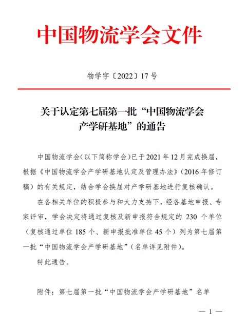 成功入选“第七届第一批中国物流学会产学研基地”名单。
