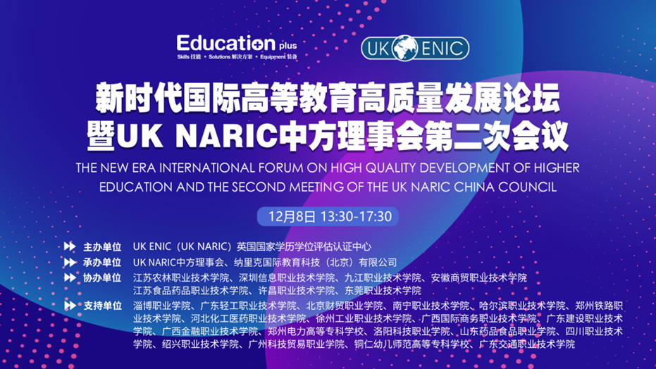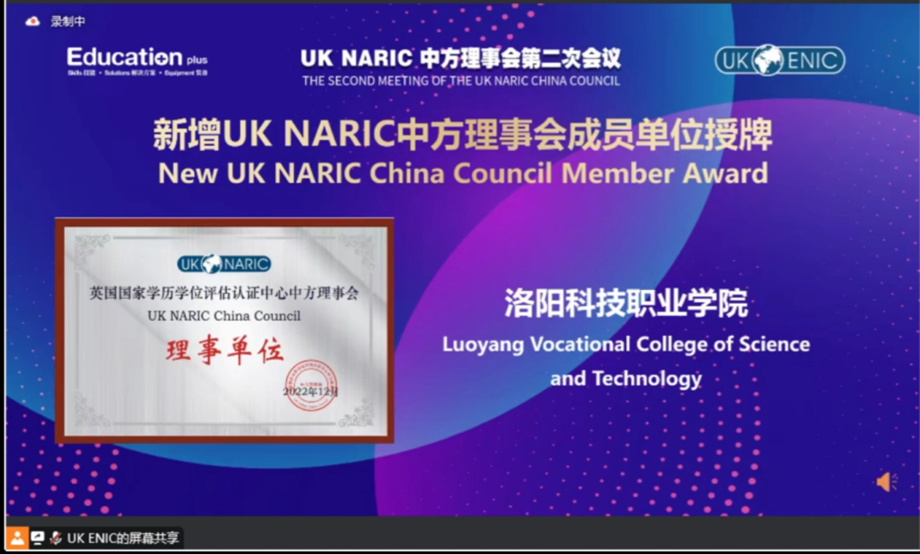 12月8日, 由UK NARIC英国国家学历学位评估认证中心主办的新时代国际高等教育高质量发展论坛暨UK NARIC中方理事会第二次会议在线上线下同步举行,洛阳科技职业英皇娱乐场