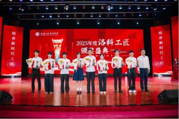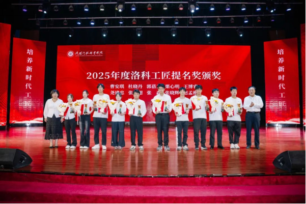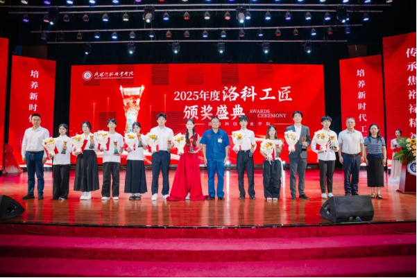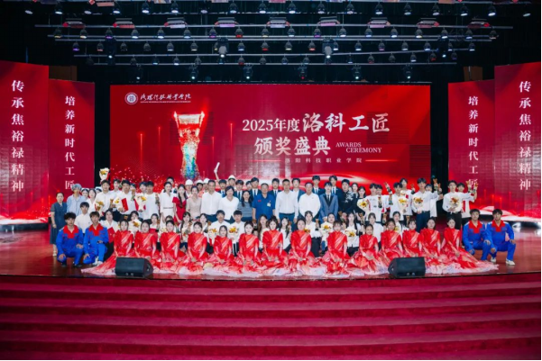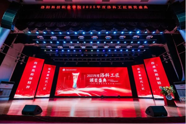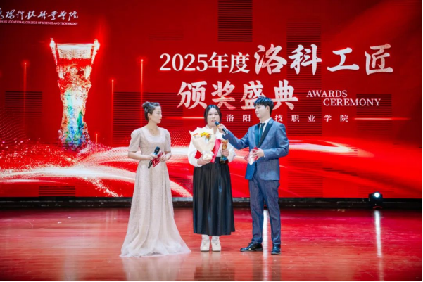 于新民学堂举行2025年度“洛科工匠”颁奖盛典。大国工匠、全国劳动模范杨金安,洛阳市教育局职业成人与高等教育科科长张三虎,共青团洛阳市委四级调研员秦卫红,洛阳科技职业英皇娱乐场