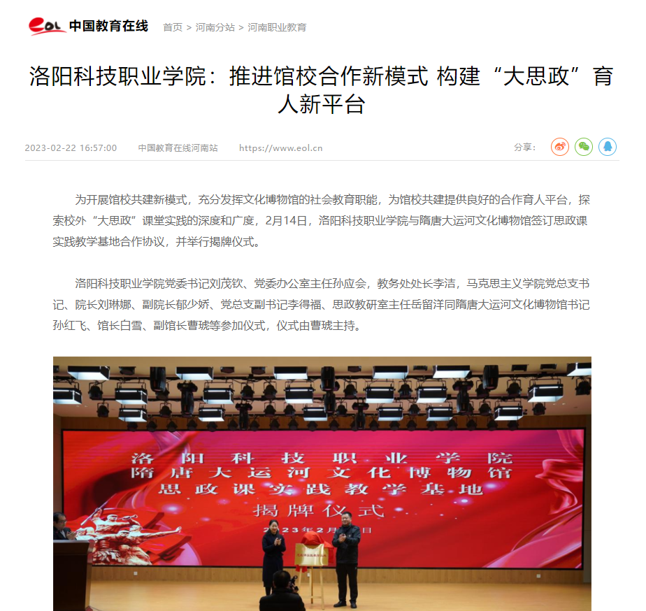 为开展馆校共建新模式,充分发挥文化博物馆的社会教育职能,为馆校共建提供良好的合作育人平台,探索校外“大思政”课堂实践的深度和广度,2月14日,洛阳科技职业英皇娱乐场