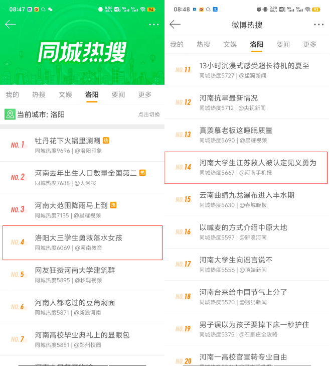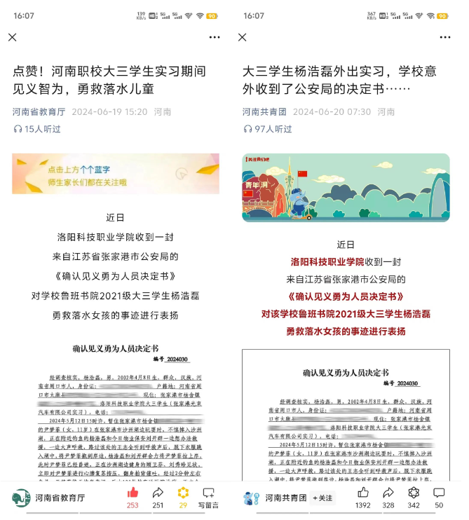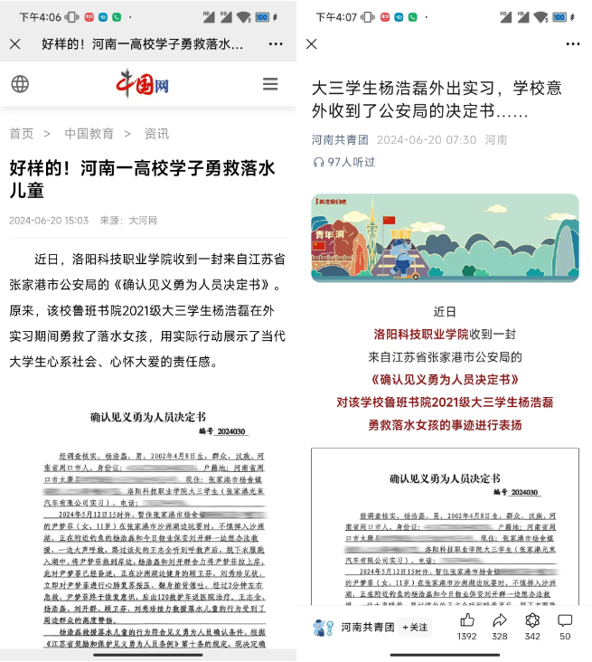 河南省教育厅、河南共青团、中国网、光明网、中国青年网、大象新闻、河南日报、大河网、中原融媒以及全省各大权威媒体均对此进行了详尽深入的报道,并特别对杨浩磊同学进行了专访,以深入了解他的事迹和背后的故事,微博同城热搜同时位列第4和14位。杨浩磊同学的行为彰显了洛科学子的责任与担当,同时也展现了当代青年应有的勇敢和智慧,进一步弘扬了社会正能量,激励了更多人积极向上,为社会的和谐与发展贡献自己的力量。