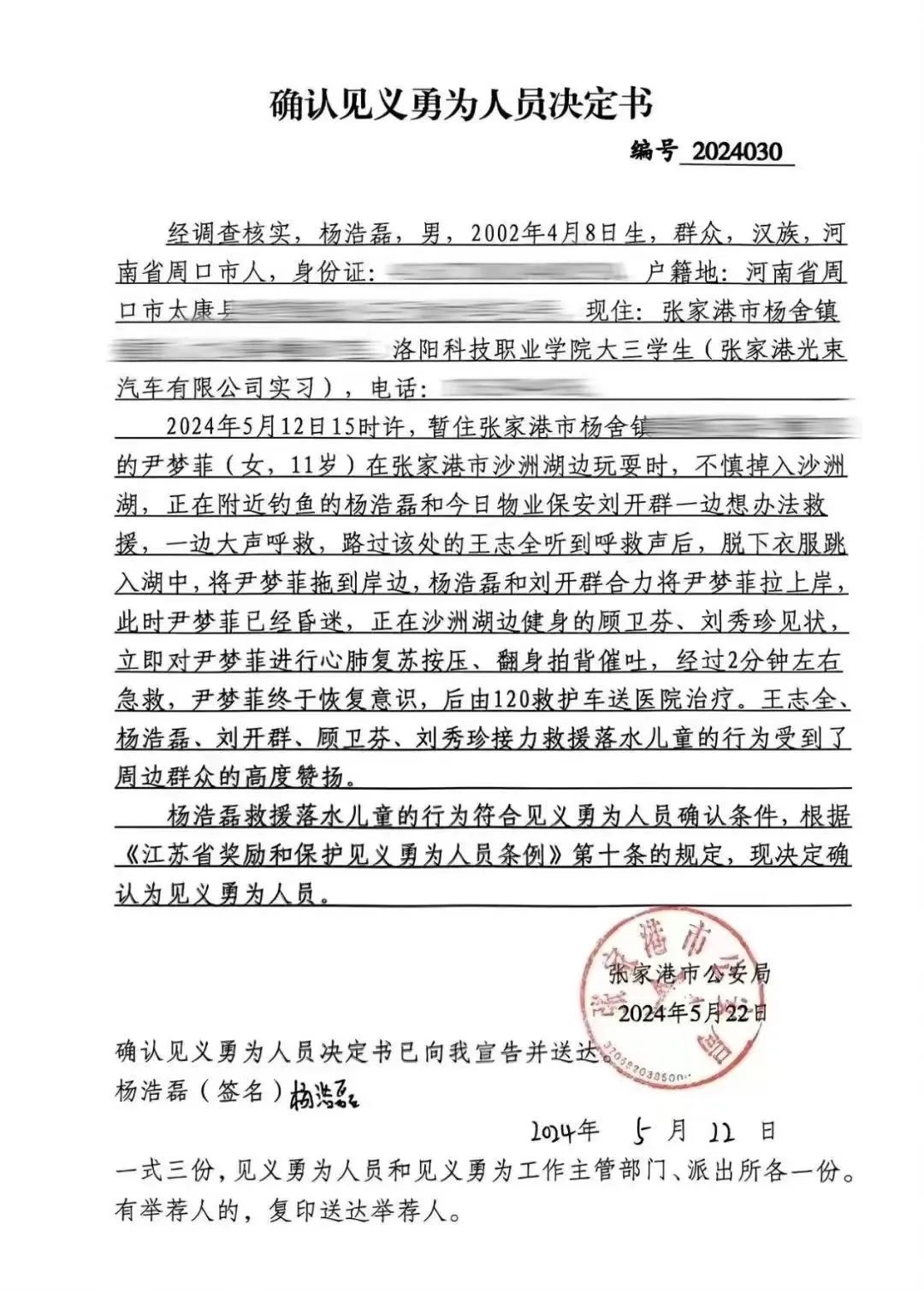 2024年5月12日,在单位实习的杨浩磊周末外出在张家港沙洲湖钓鱼时,发现一小女孩独自玩耍不慎落水。虽然杨浩磊不会游泳,但他深知时间就是生命,迅速用木棍试图救援,并呼救求助。热心群众纷纷响应,合力将女孩救起。事后张家港市公安局对杨浩磊等人的见义勇为行为给予了认定,并发来了《确认见义勇为人员决定书》。
