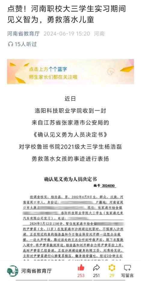 2024年6月19日,河南省教育厅官微点赞洛科学子杨浩磊,对其见义智为、勇救落水女孩的事迹表示高度赞扬。