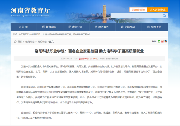 2024年10月28日,河南省教育厅报道洛科以举办“百名企业家”进校园座谈会为契机,不断深化人才培养模式改革,构建与河南省高质量发展紧密融合和高度契合的高等教育发展新格局。
