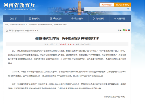 仲景书院的“张仲景医药文化体验日”活动被河南省教育厅官网报道,旨在激发更多大学生对中医药文化的兴趣和热爱,为推动健康生活理念的传播和共建健康校园贡献力量。