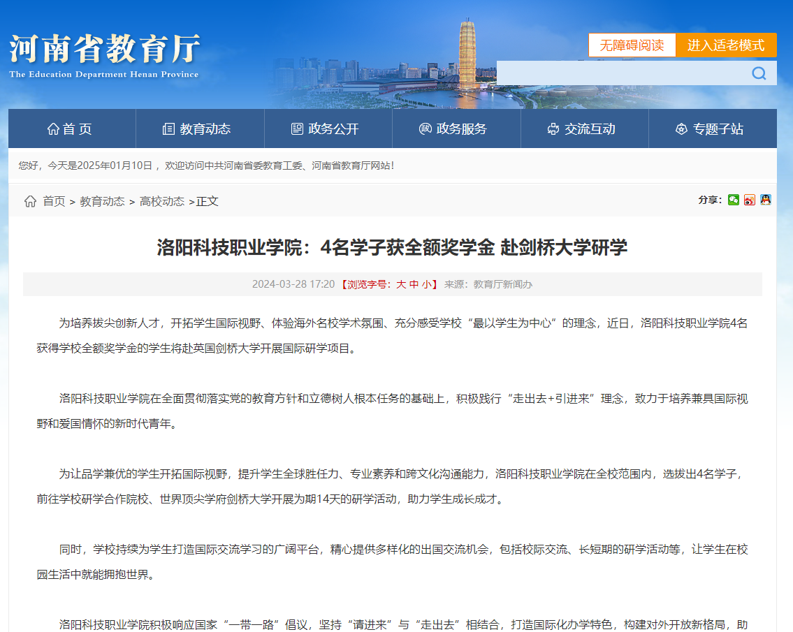 2024年3月28日,河南省教育厅报道了洛科4名学子获全额奖学金,赴剑桥大学研学相关新闻,聚焦在全面贯彻落实党的教育方针和立德树人根本任务的基础上,英皇娱乐场