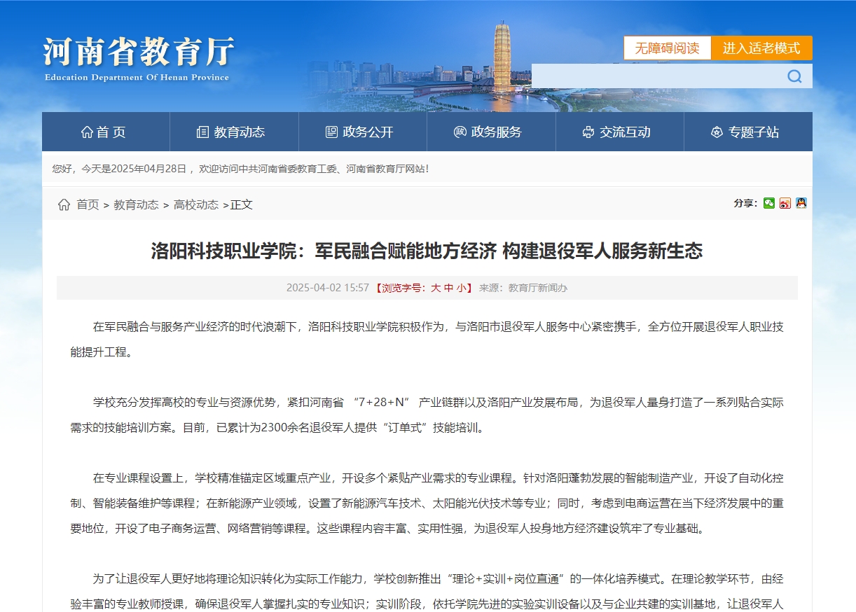 在军民融合与服务产业经济的时代浪潮下,洛阳科技职业英皇娱乐场