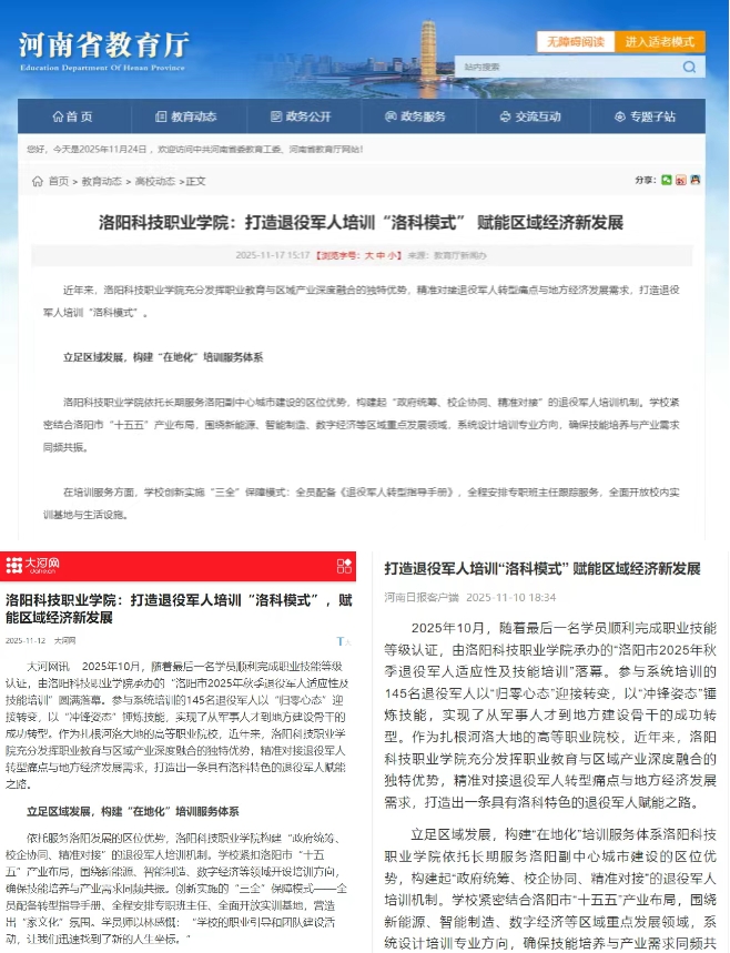 充分发挥职业教育与区域产业深度融合的独特优势,精准对接退役军人转型痛点与地方经济发展需求,打造退役军人培训“洛科模式”。相关工作成果被河南省教育厅以及多家媒体报道。