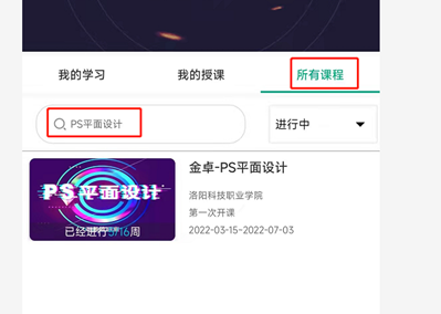 3.查找课程,在APP登入后英皇娱乐场,点击MOOC在【所有课程】搜索PS平面设计。