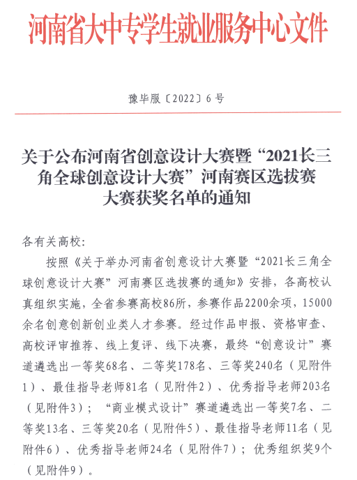 近日,由河南省大中专学生就业服务中心主办的河南省创意设计大赛暨“2021长三角全球创意设计大赛”河南赛区选拔赛的获奖名单已公布,洛阳科技职业英皇娱乐场