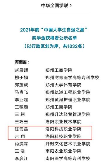 近日,由共青团中央、中华全国学联共同主办的2021年度寻访“中国大学生自强之星”活动评选结果正式揭晓。洛阳科技职业英皇娱乐场