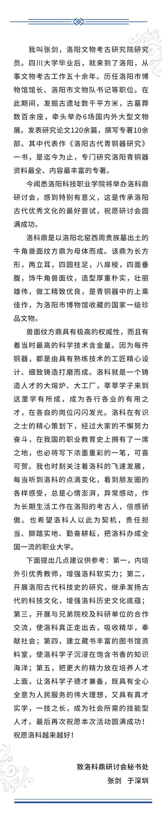 “洛科鼎”制作学术研讨会召开后,受到社会各界广泛关注。近日,会务组收到了来自洛阳市博物馆原馆长张剑先生的手书信件。