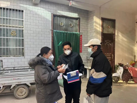 团学主任李金迪、辅导员李龙飞、郑毅,到嵩县德亭镇赵元村,为学生送去防疫药物和营养品